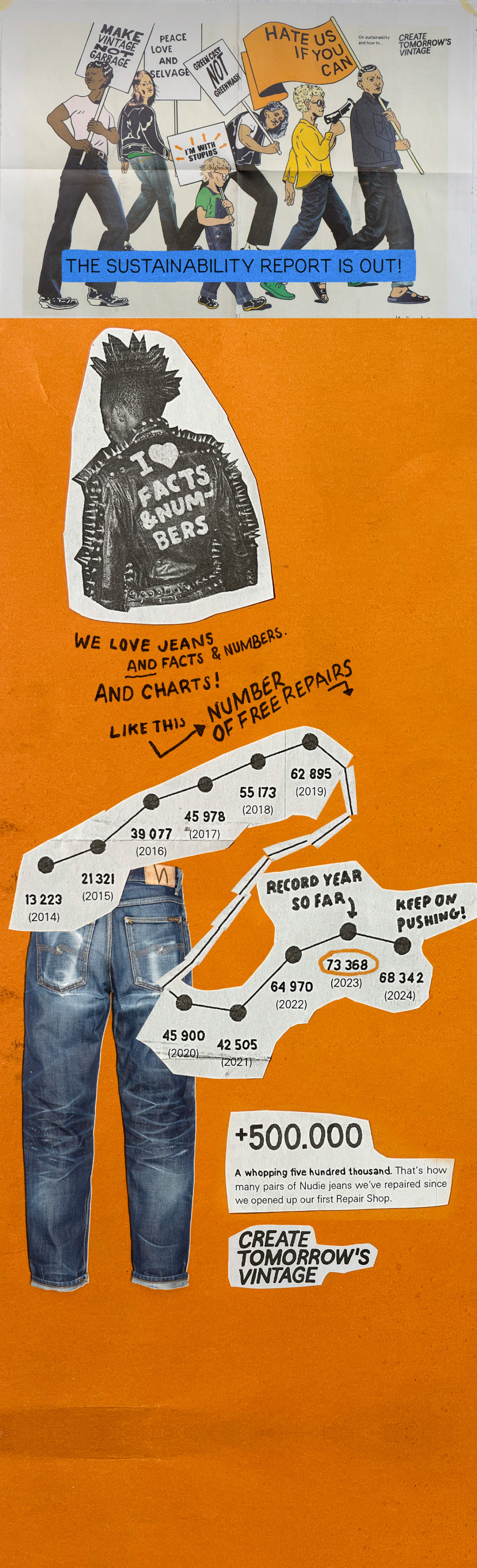 This report provides a straightforward look at how we handle materials, production, and our products, as well as what it's like to work at Nudie Jeans. Want to see more detailed numbers and charts? – Check out the complete 100+ page report.